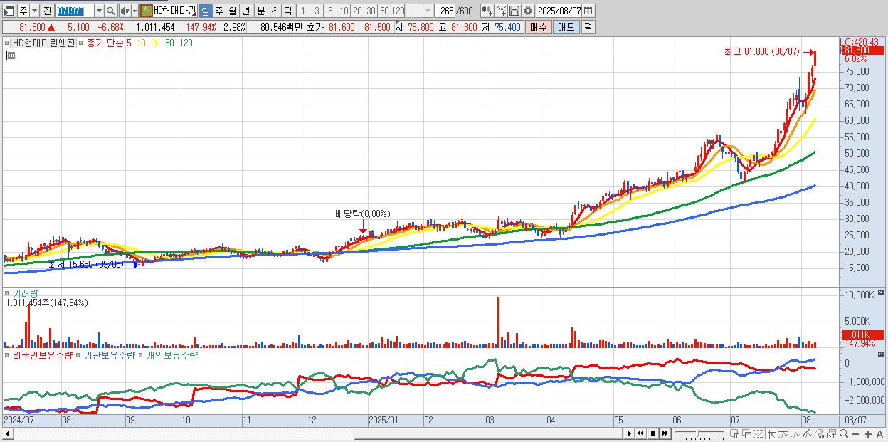 - HD현대마린엔진 (81,800원 ▲ 7.07% , 시총: 27,748억, 거래량: 655,086, 거래대금:523억, KOSPI)