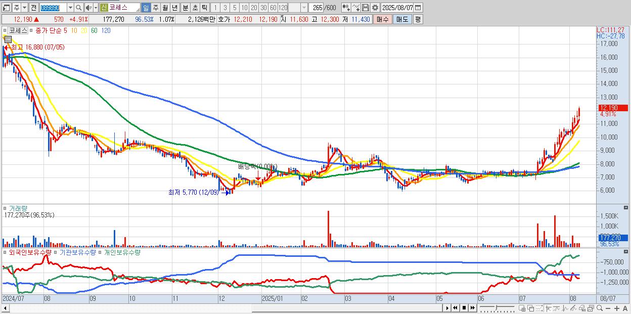 - 코세스 (12,190원 ▲ 4.91% , 시총: 2,022억, 거래량: 177,270, 거래대금:21억, KOSDAQ)