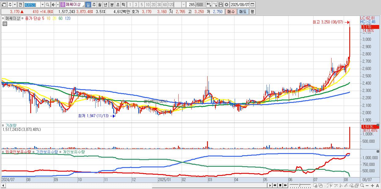 - 메쎄이상 (3,170원 ▲ 14.86% , 시총: 1,370억, 거래량: 1,517,243, 거래대금:46억, KOSDAQ)