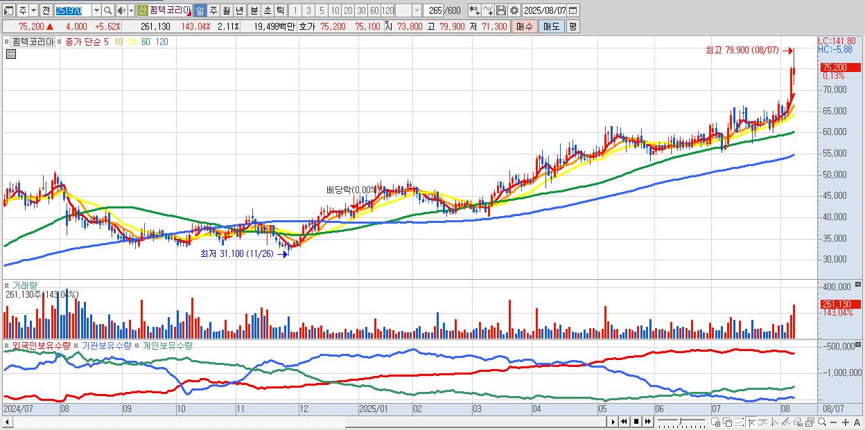 - 펌텍코리아 (73,100원 ▲ 2.67% , 시총: 9,064억, 거래량: 109,166, 거래대금:79억, KOSDAQ)