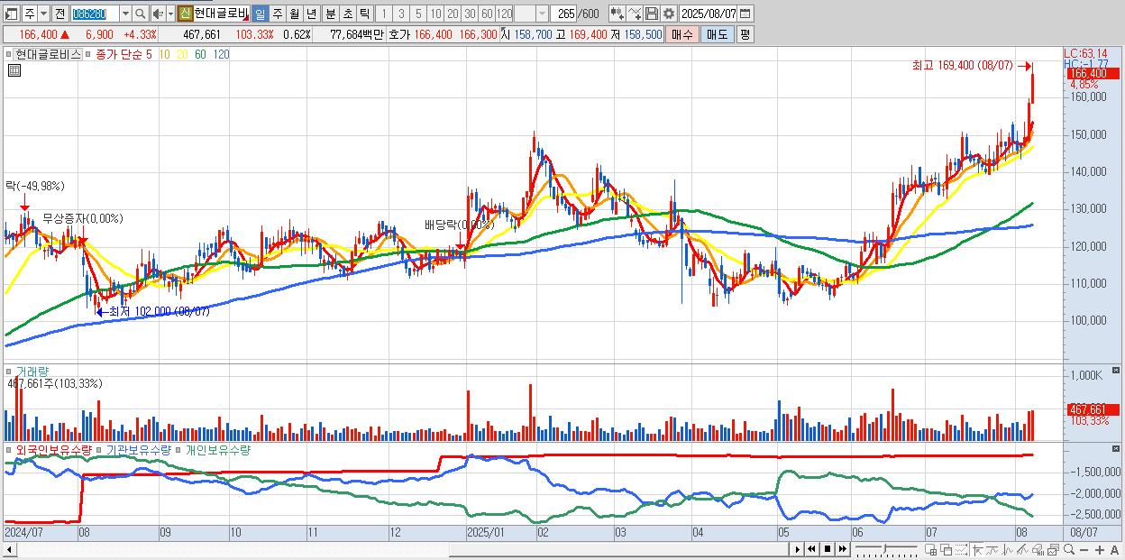- 현대글로비스 (166,700원 ▲ 4.51% , 시총: 125,025억, 거래량: 390,135, 거래대금:648억, KOSPI)