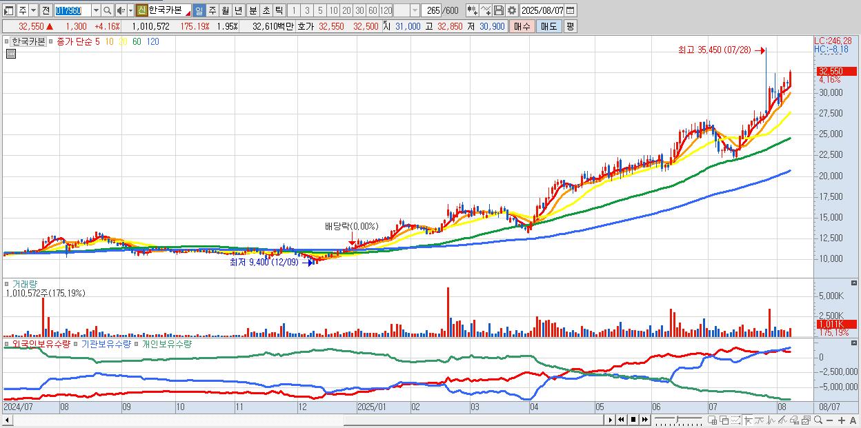 - 한국카본 (32,450원 ▲ 3.84% , 시총: 16,844억, 거래량: 669,568, 거래대금:216억, KOSPI)