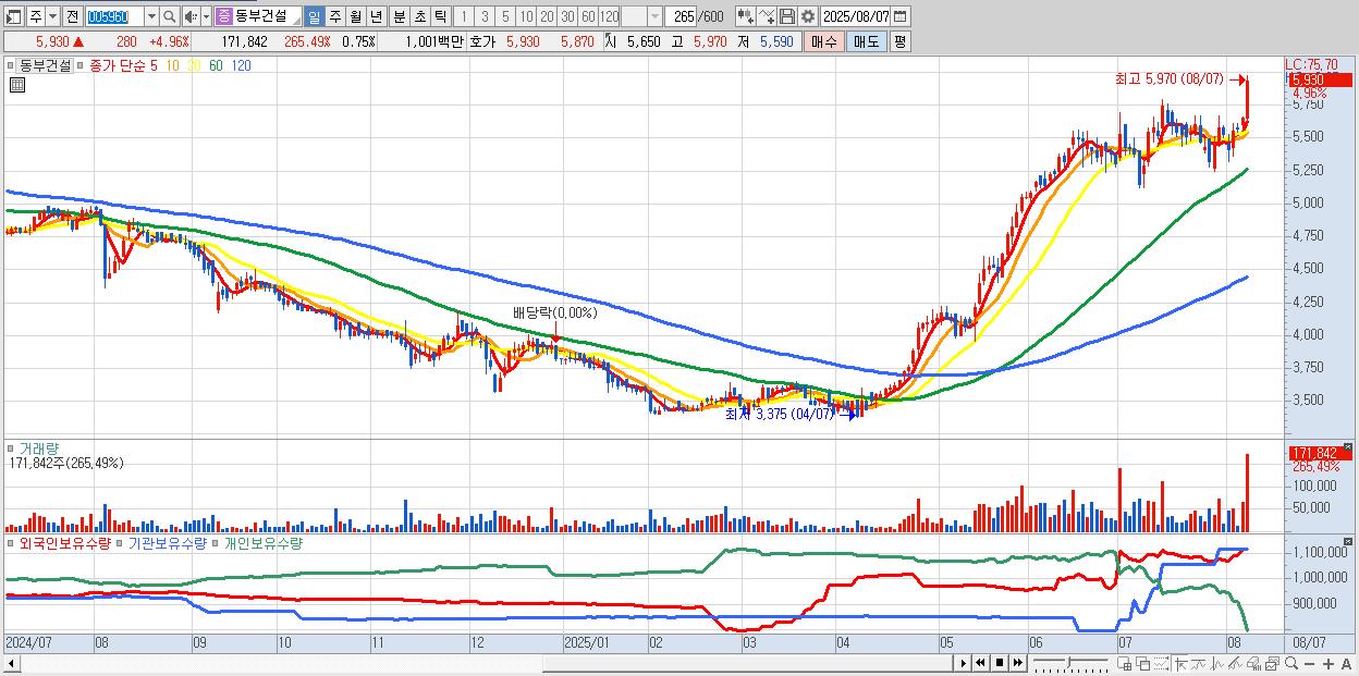 - 동부건설 (5,930원 ▲ 4.96% , 시총: 1,361억, 거래량: 171,842, 거래대금:10억, KOSPI)