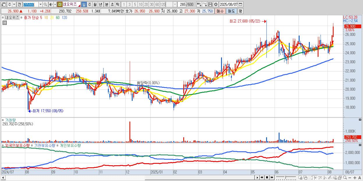- 네오위즈 (26,950원 ▲ 4.46% , 시총: 5,890억, 거래량: 179,640, 거래대금:48억, KOSDAQ)