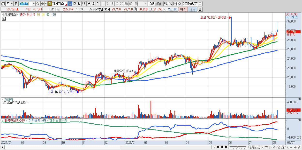 엠씨넥스 29,950원 ▲ 1.01% (KOSPI, 097520)