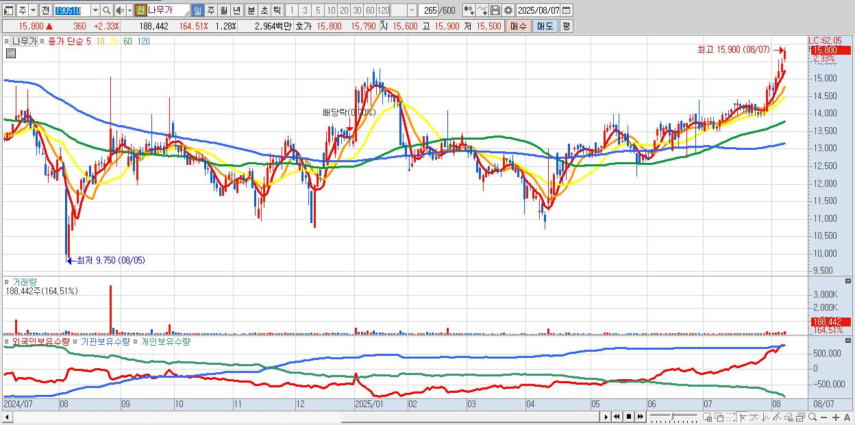 - 나무가 (15,800원 ▲ 2.33% , 시총: 2,320억, 거래량: 188,442, 거래대금:30억, KOSDAQ)