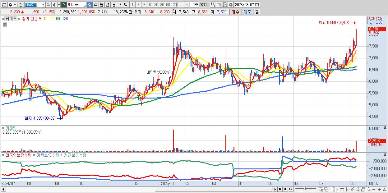 - 케이프 (8,230원 ▲ 9.15% , 시총: 2,543억, 거래량: 2,290,869, 거래대금:188억, KOSDAQ)