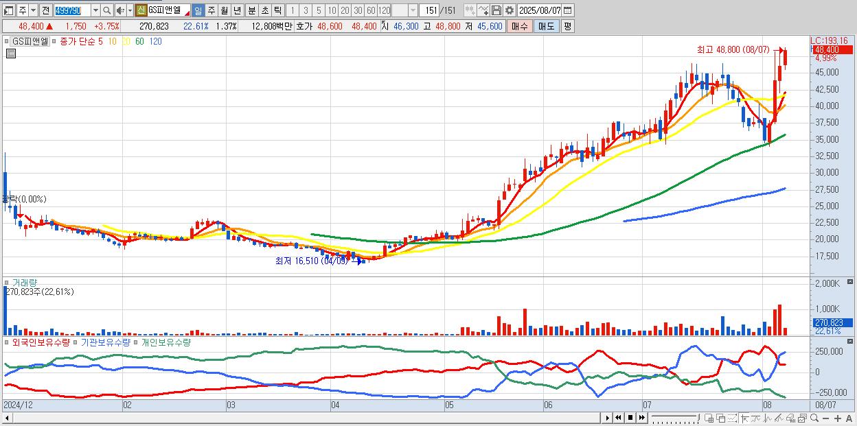 - GS피앤엘 (48,500원 ▲ 3.97% , 시총: 9,618억, 거래량: 186,603, 거래대금:88억, KOSPI)
