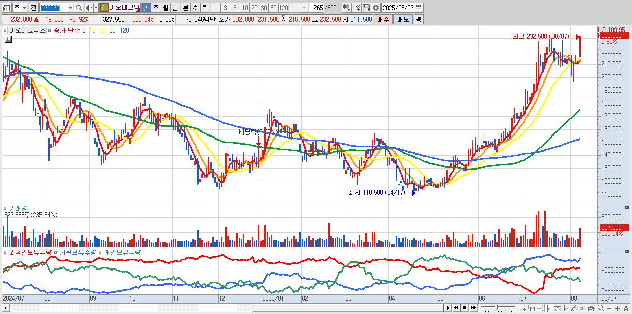 - 이오테크닉스 (232,000원 ▲ 8.92% , 시총: 28,581억, 거래량: 201,420, 거래대금:455억, KOSDAQ)