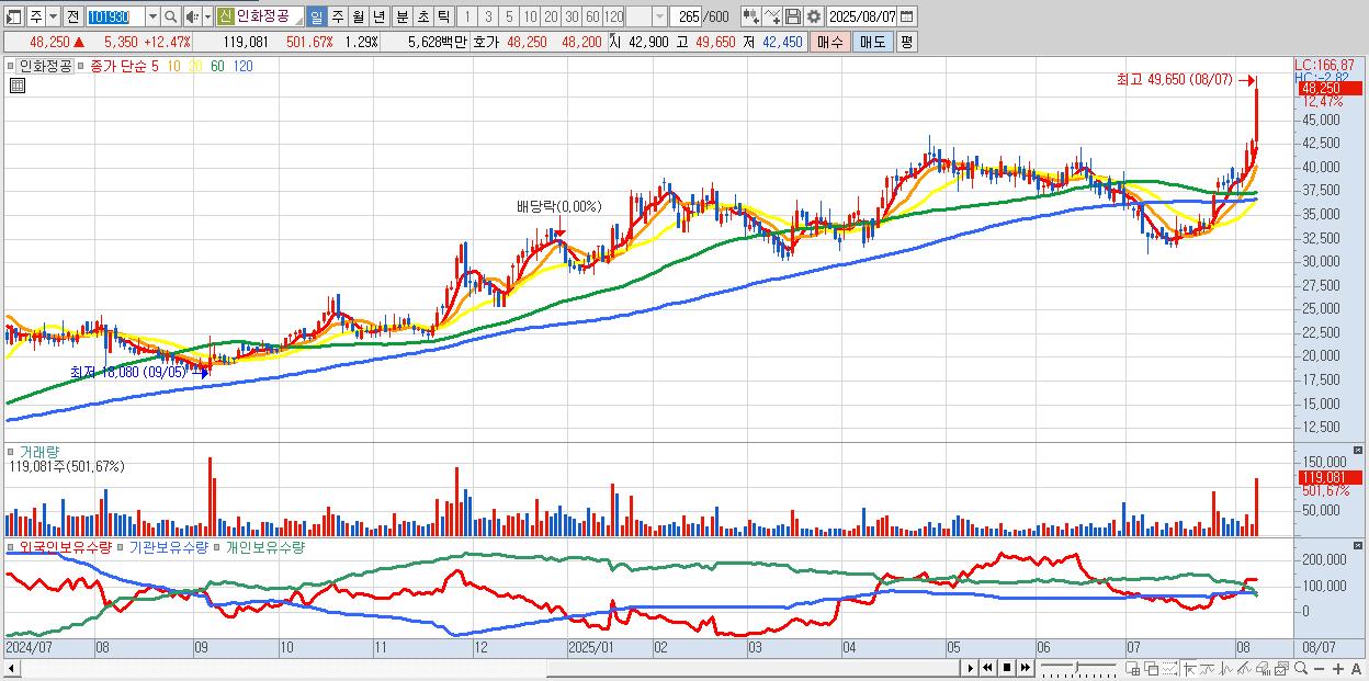 - 인화정공 (48,250원 ▲ 12.47% , 시총: 4,455억, 거래량: 119,081, 거래대금:56억, KOSDAQ)