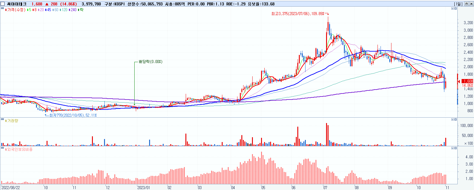 - 씨아이테크 (1,608원 ▲ 14.86% , 시총: 805억, 거래량: 3,981,282, 거래대금:64억)