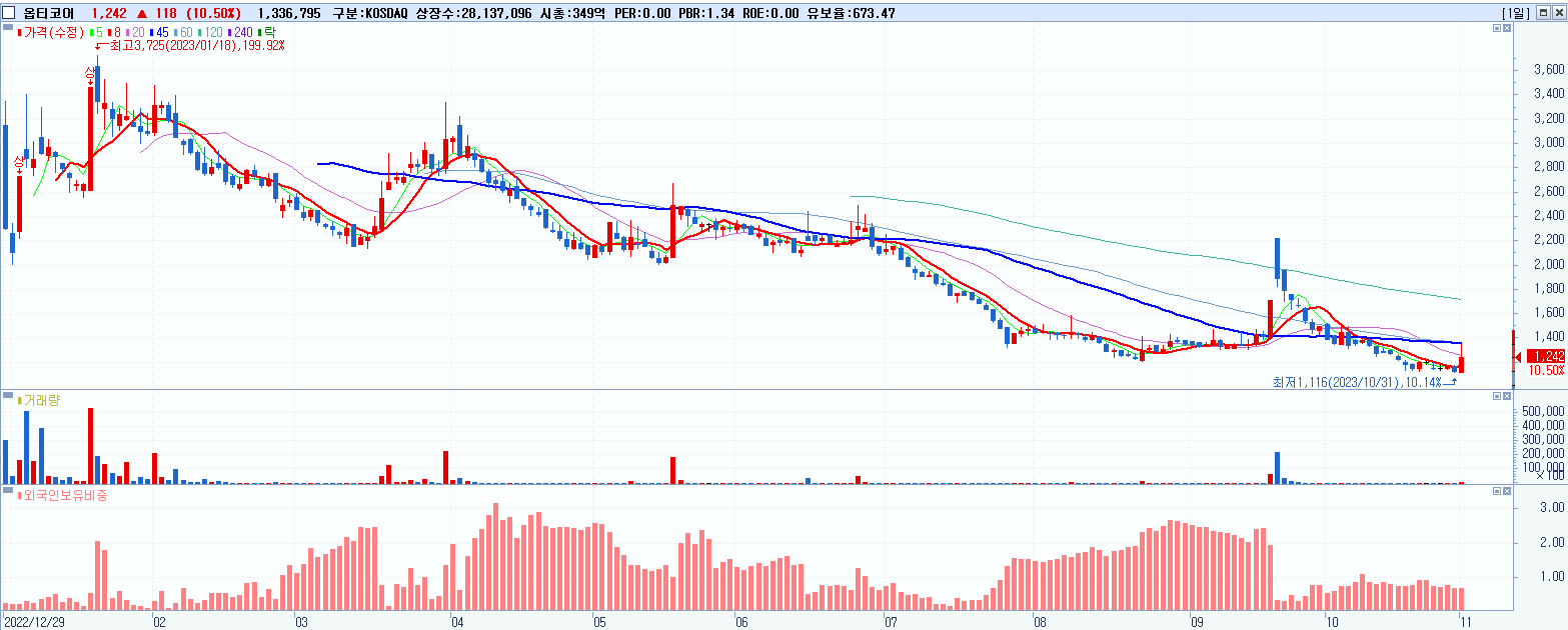 - 옵티코어 (1,242원 ▲ 10.5% , 시총: 349억, 거래량: 1,336,960, 거래대금:17억)