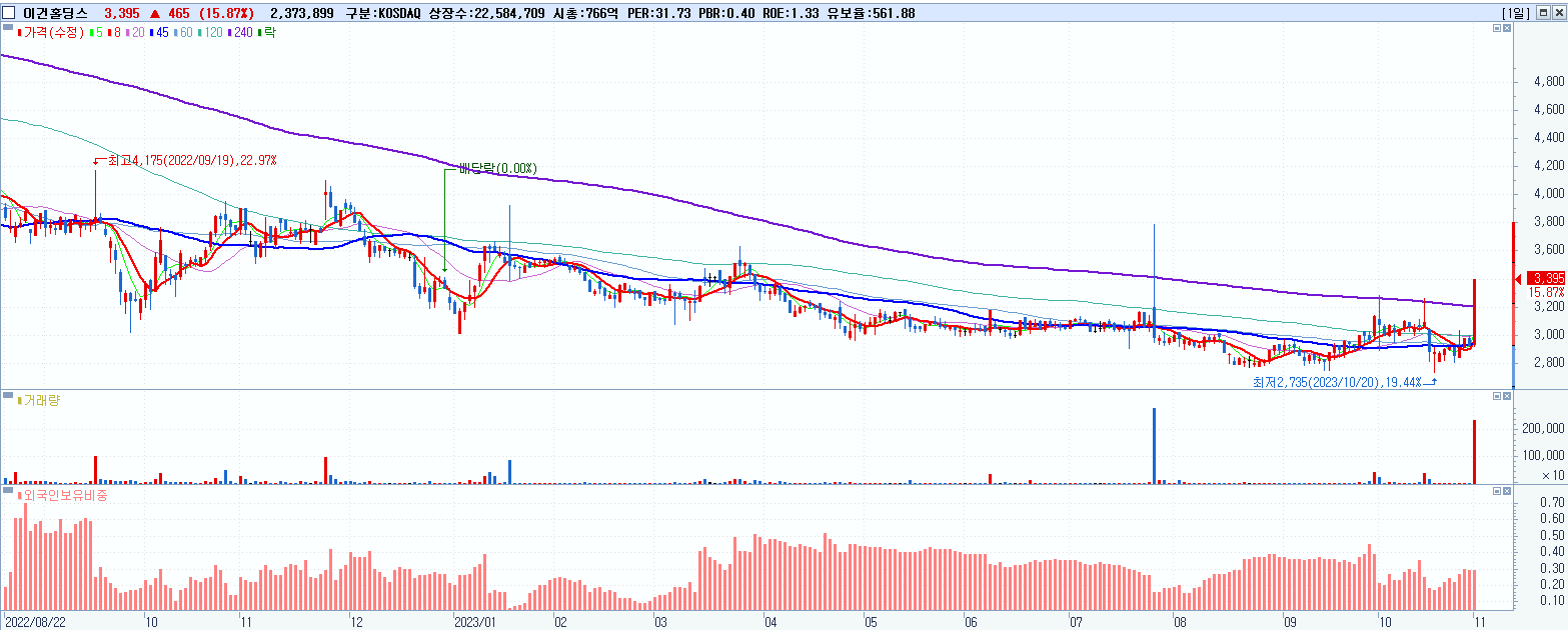 - 이건홀딩스 (3,395원 ▲ 15.87% , 시총: 767억, 거래량: 2,415,983, 거래대금:76억)