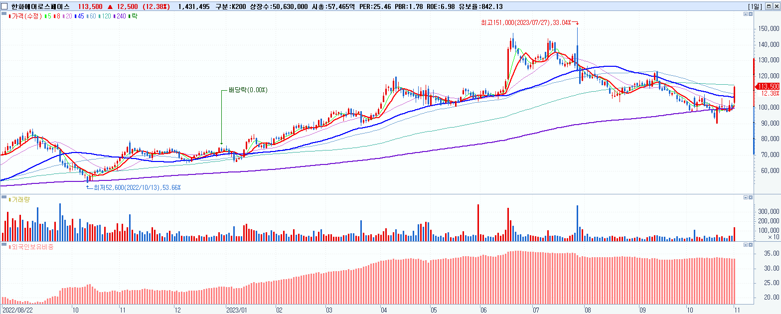 - 한화에어로스페이스 (113,500원 ▲ 12.38% , 시총: 57,465억, 거래량: 1,432,011, 거래대금:1,572억)