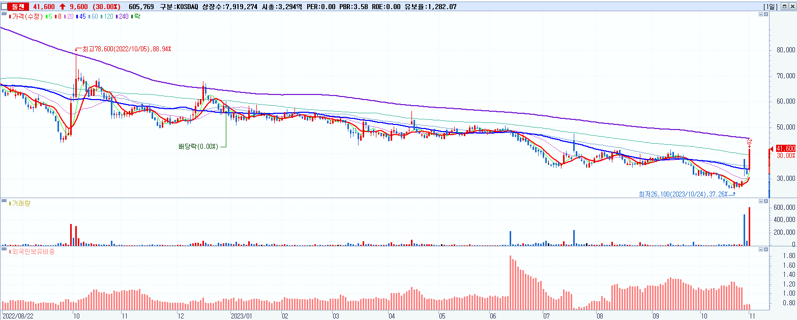 시총: 3,294억 거래량: 605,772 거래대금:228억