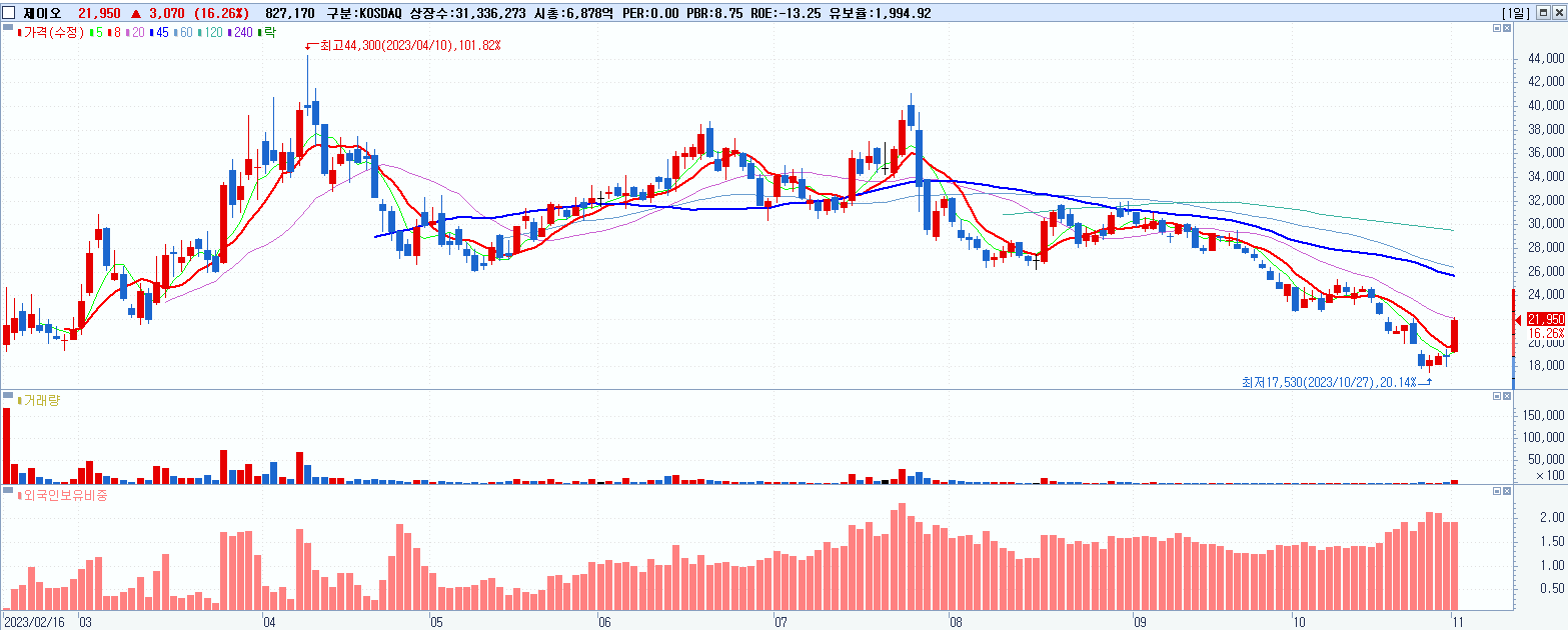 - 제이오 (21,950원 ▲ 16.26% , 시총: 6,878억, 거래량: 827,276, 거래대금:174억)