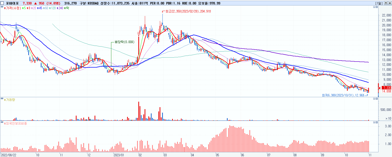 - 포바이포 (7,330원 ▲ 14.89% , 시총: 812억, 거래량: 316,351, 거래대금:22억)
