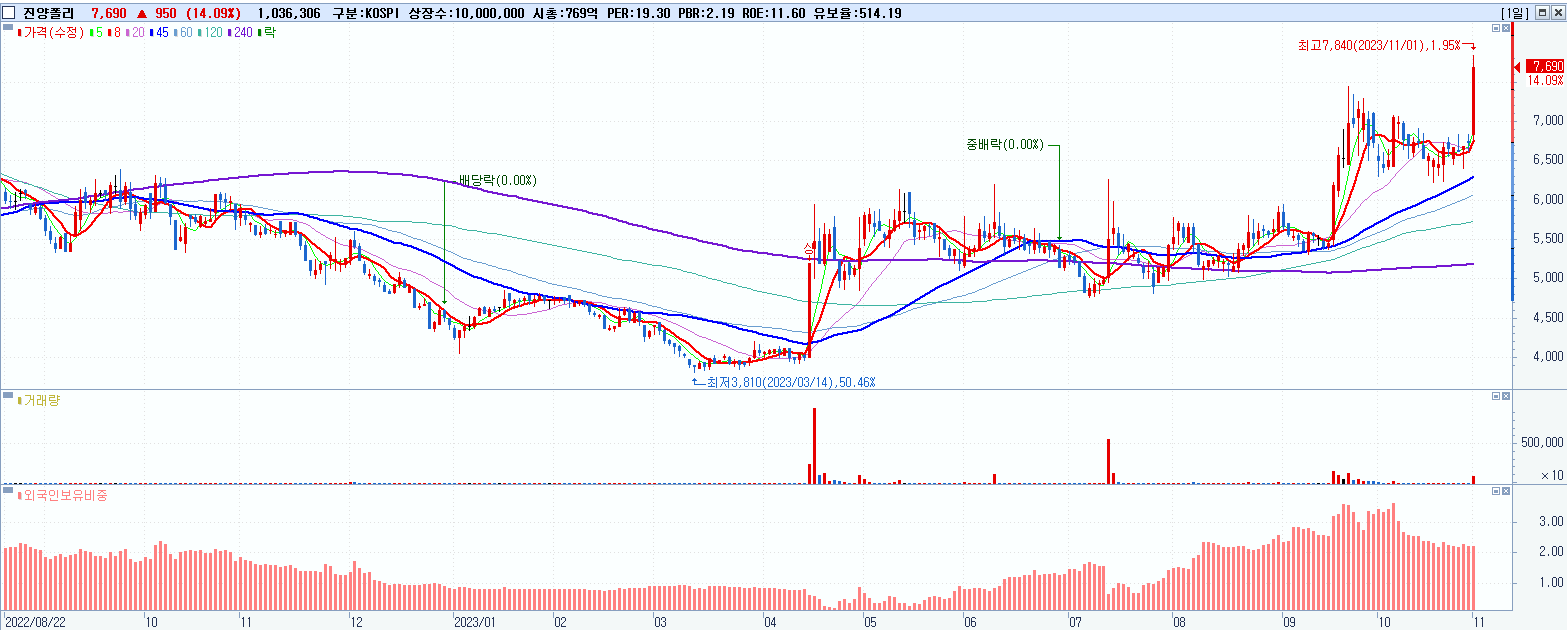 시총: 592억 거래량: 72,085,846 거래대금:1,239억