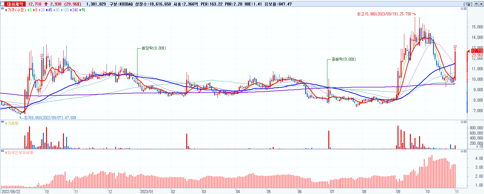 - 대화제약 (12,710원 ▲ 29.96% , 시총: 2,366억, 거래량: 1,381,829, 거래대금:160억)