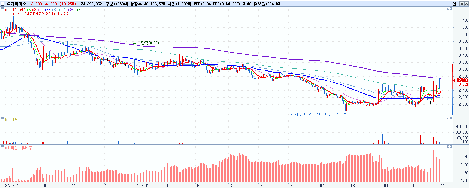- 우리바이오 (2,690원 ▲ 10.25% , 시총: 1,303억, 거래량: 23,321,781, 거래대금:646억)