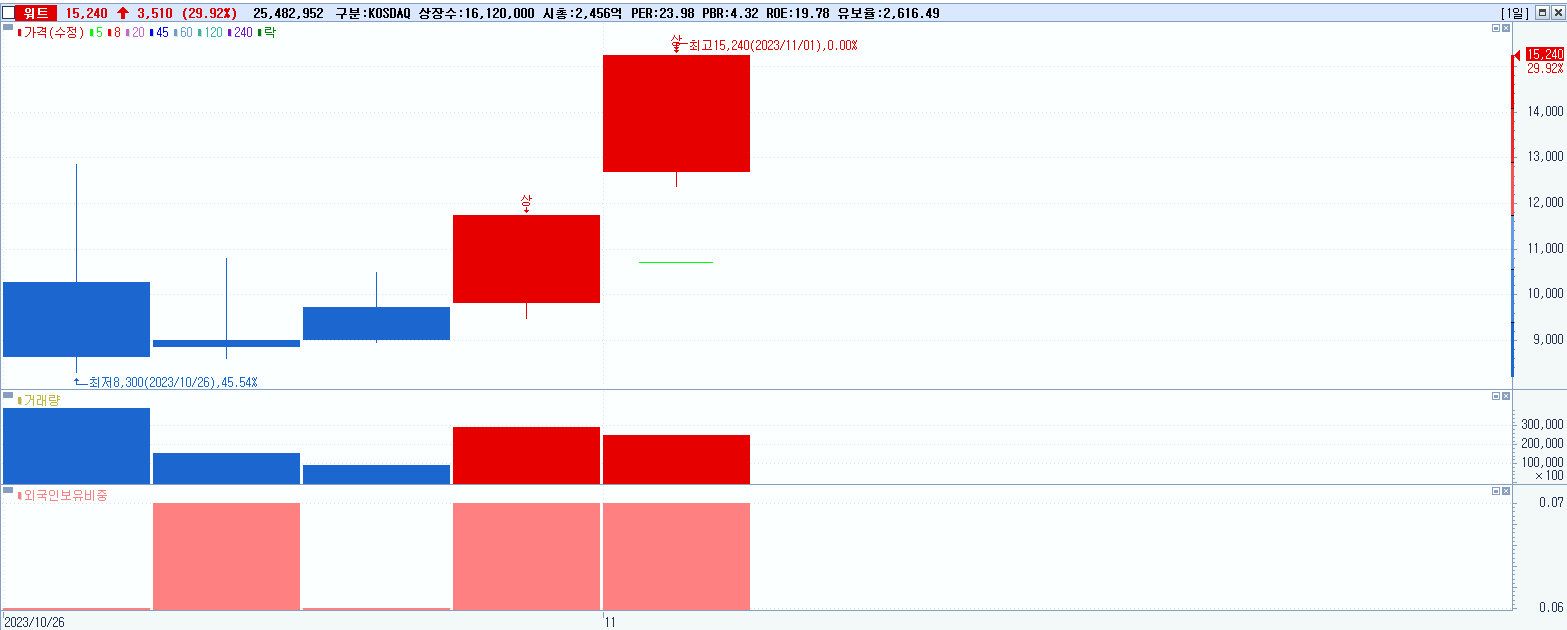 - 워트 (15,240원 ▲ 29.92% , 시총: 2,457억, 거래량: 25,515,827, 거래대금:3,488억)