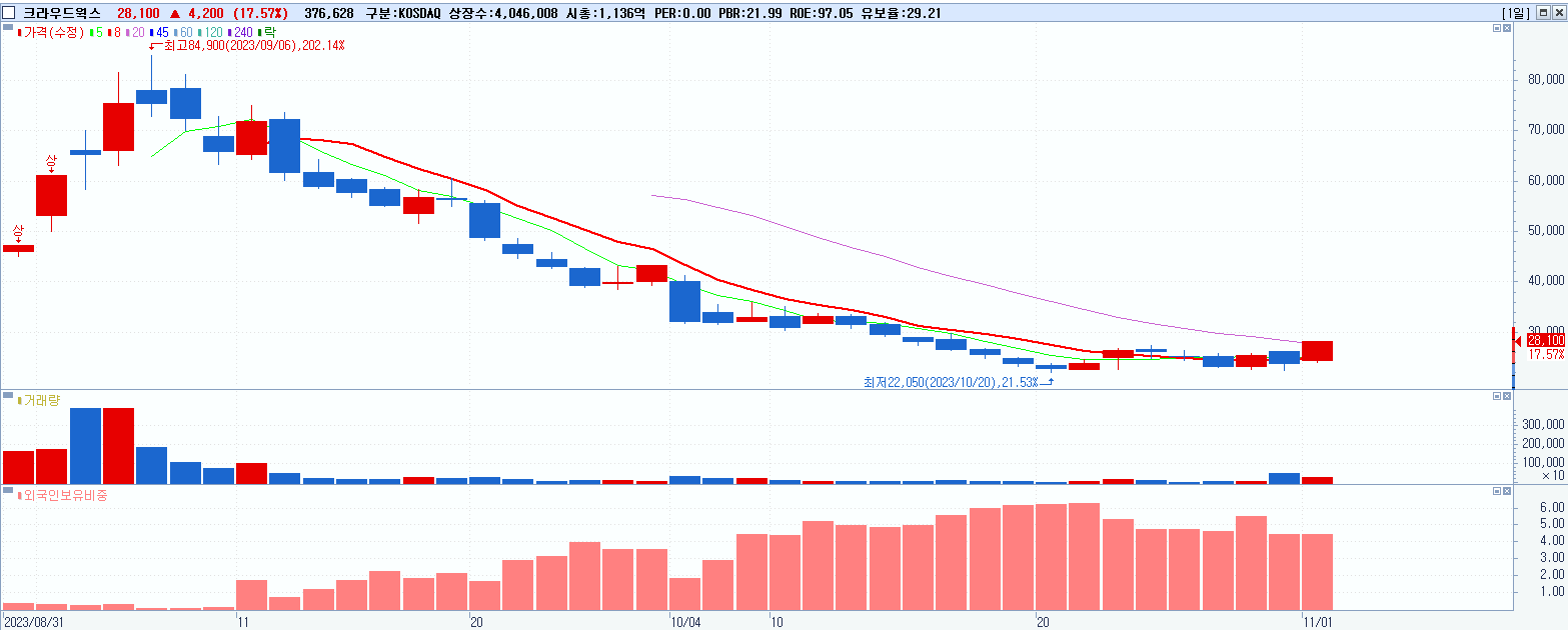 - 크라우드웍스 (28,100원 ▲ 17.57% , 시총: 1,137억, 거래량: 376,787, 거래대금:99억)