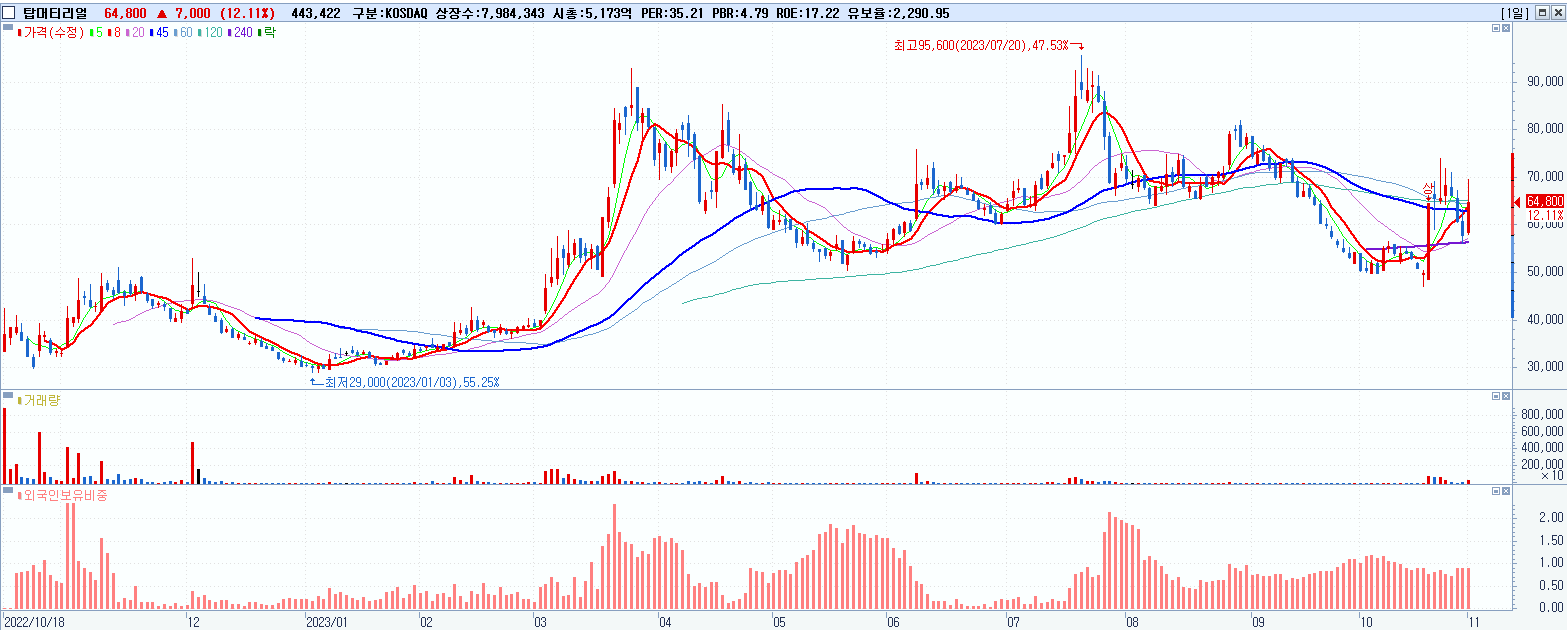 - 탑머티리얼 (64,800원 ▲ 12.11% , 시총: 5,174억, 거래량: 443,649, 거래대금:293억)