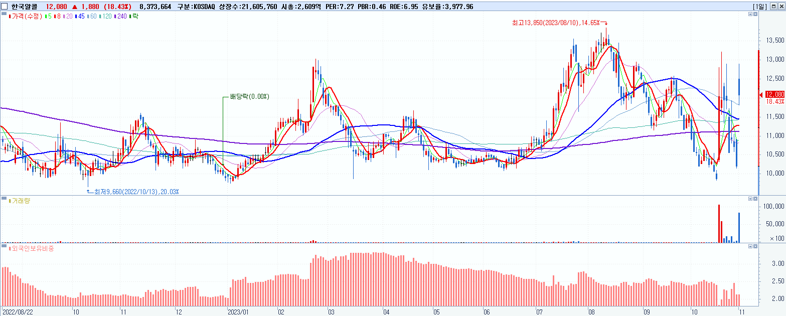 - 한국알콜 (12,080원 ▲ 18.43% , 시총: 2,610억, 거래량: 8,380,301, 거래대금:1,039억)