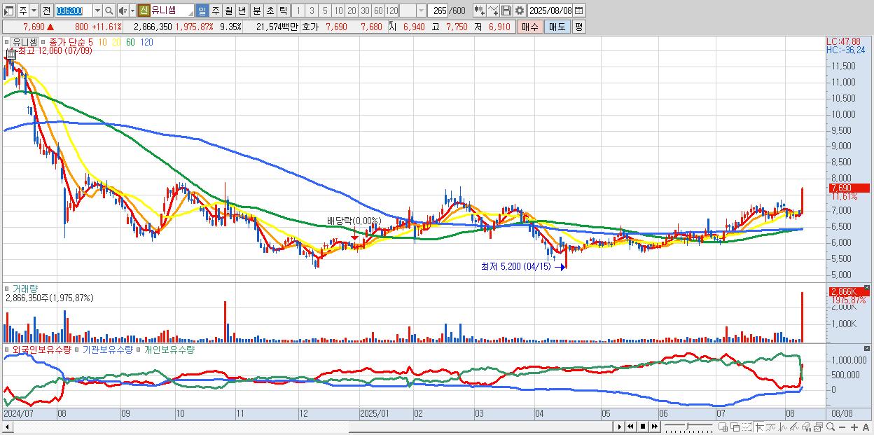 - 유니셈 (7,690원 ▲ 11.61% , 시총: 2,358억, 거래량: 2,866,350, 거래대금:216억)