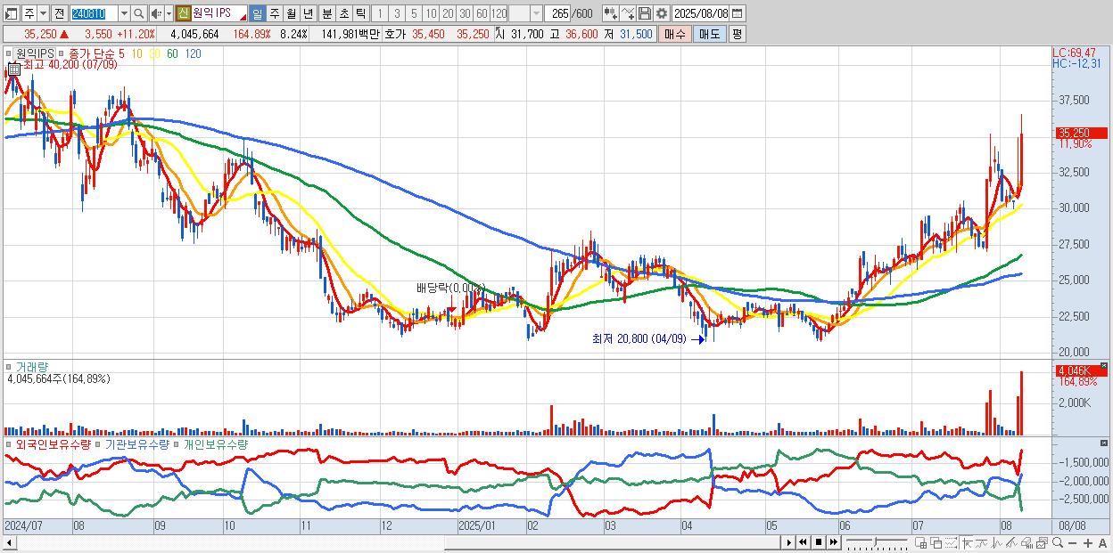 - 원익IPS (35,850원 ▲ 13.09% , 시총: 17,597억, 거래량: 2,431,714, 거래대금:856억)