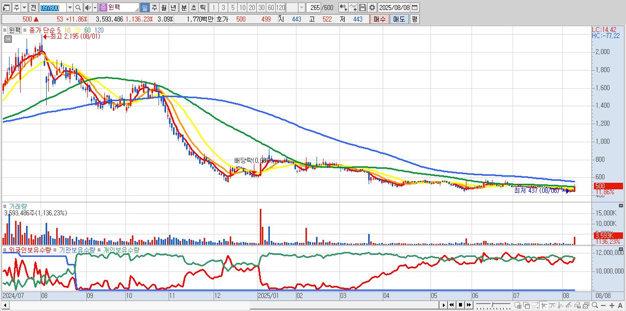 - 윈팩 (500원 ▲ 11.86% , 시총: 582억, 거래량: 3,593,486, 거래대금:18억)
