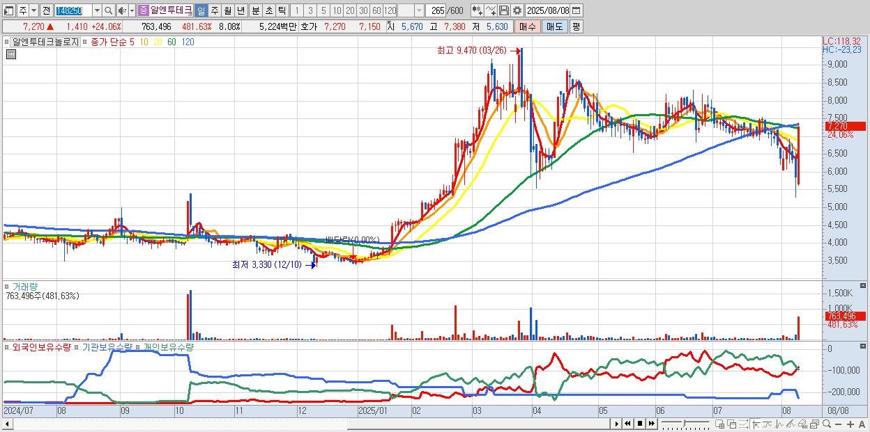 - 알엔투테크놀로지 (7,270원 ▲ 24.06% , 시총: 687억, 거래량: 763,496, 거래대금:52억)