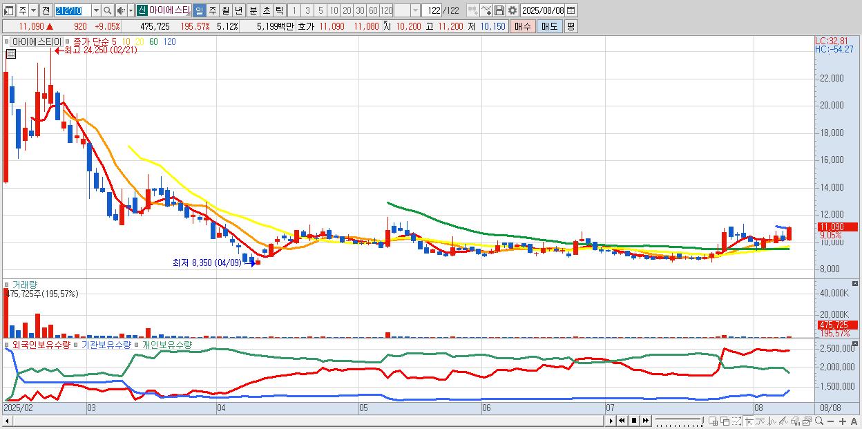 - 아이에스티이 (11,090원 ▲ 9.05% , 시총: 1,030억, 거래량: 475,725, 거래대금:52억)