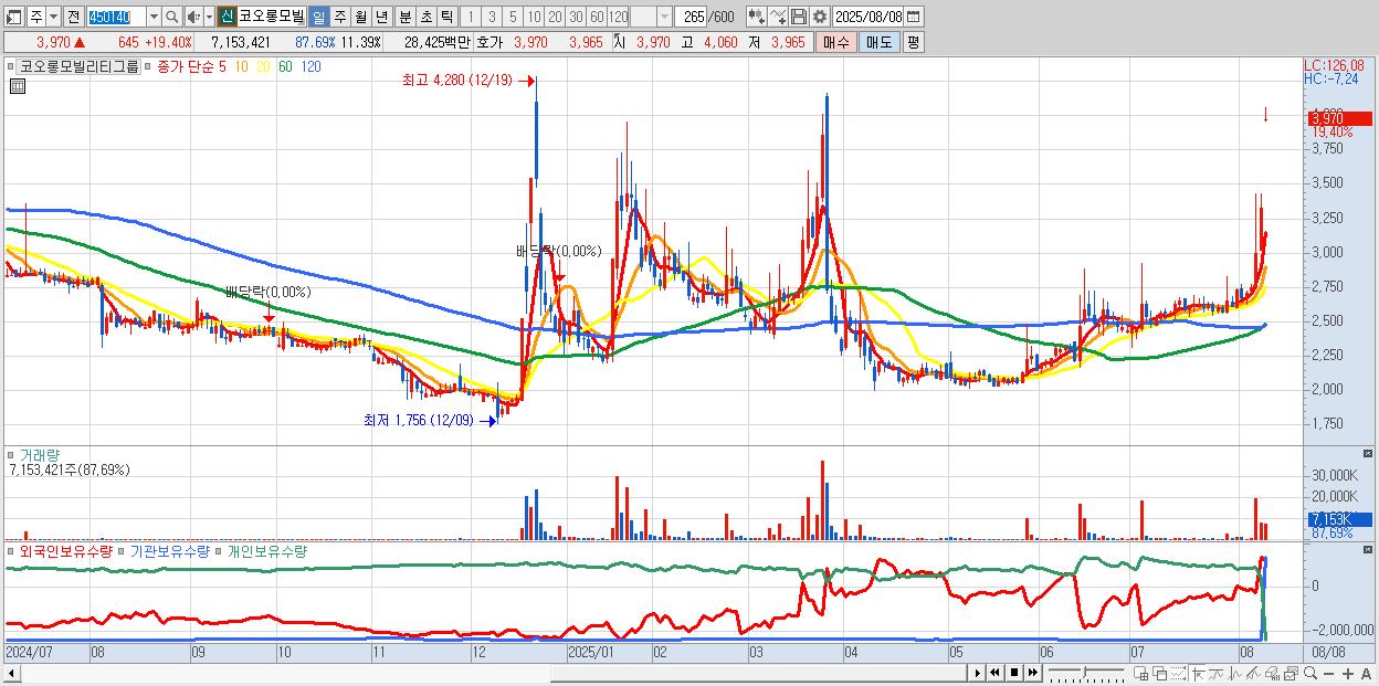 - 코오롱모빌리티그룹 (3,970원 ▲ 19.4% , 시총: 2,492억, 거래량: 7,153,421, 거래대금:284억)