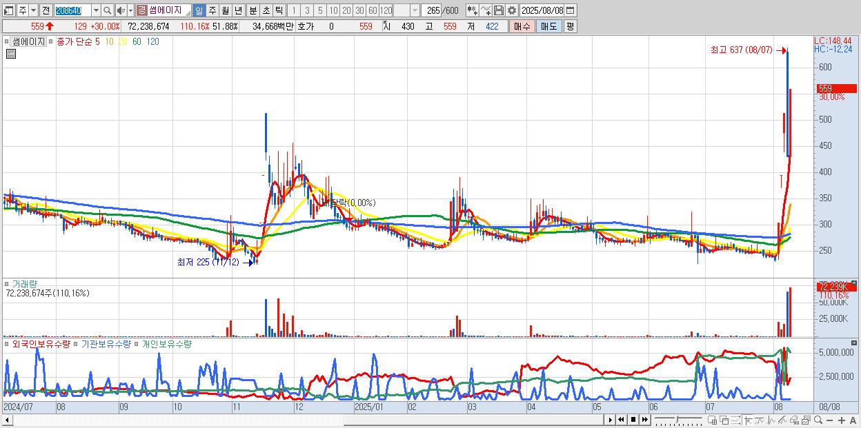 - 썸에이지 (559원 ▲ 30% , 시총: 778억, 거래량: 72,238,674, 거래대금:347억)