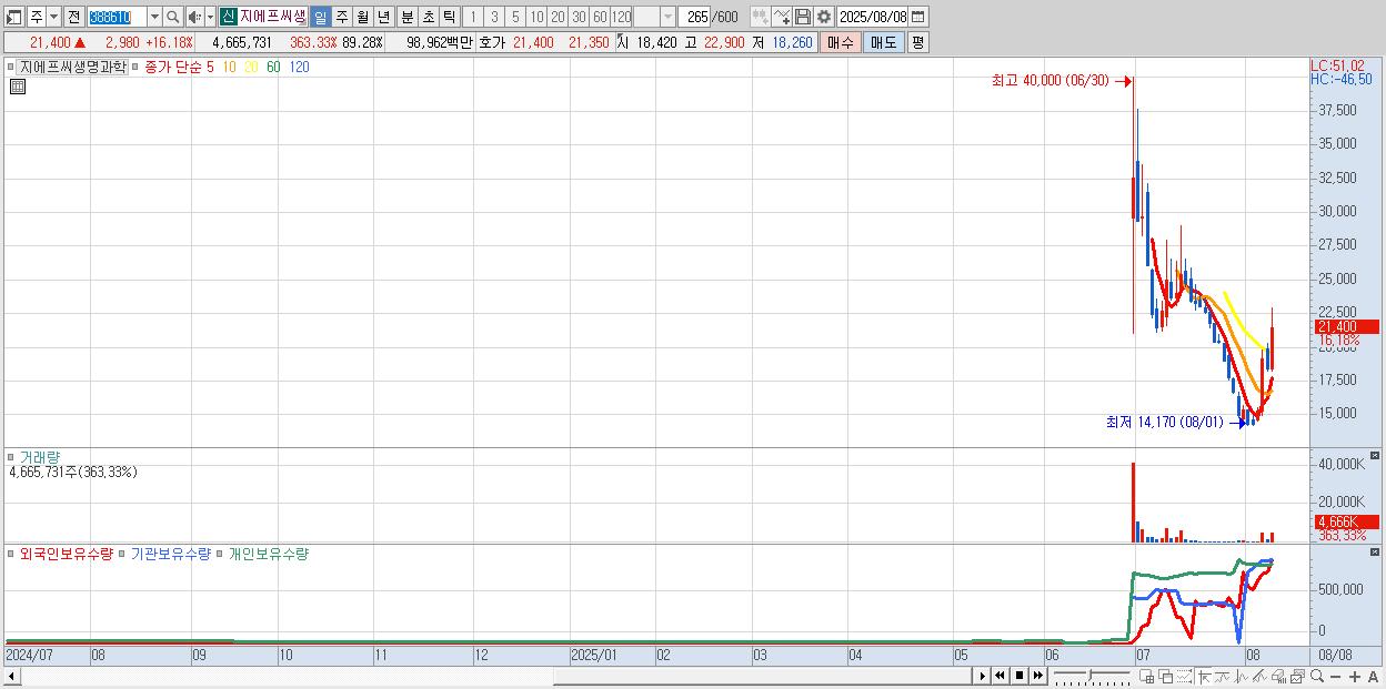 - 지에프씨생명과학 (21,400원 ▲ 16.18% , 시총: 1,118억, 거래량: 4,665,731, 거래대금:990억)