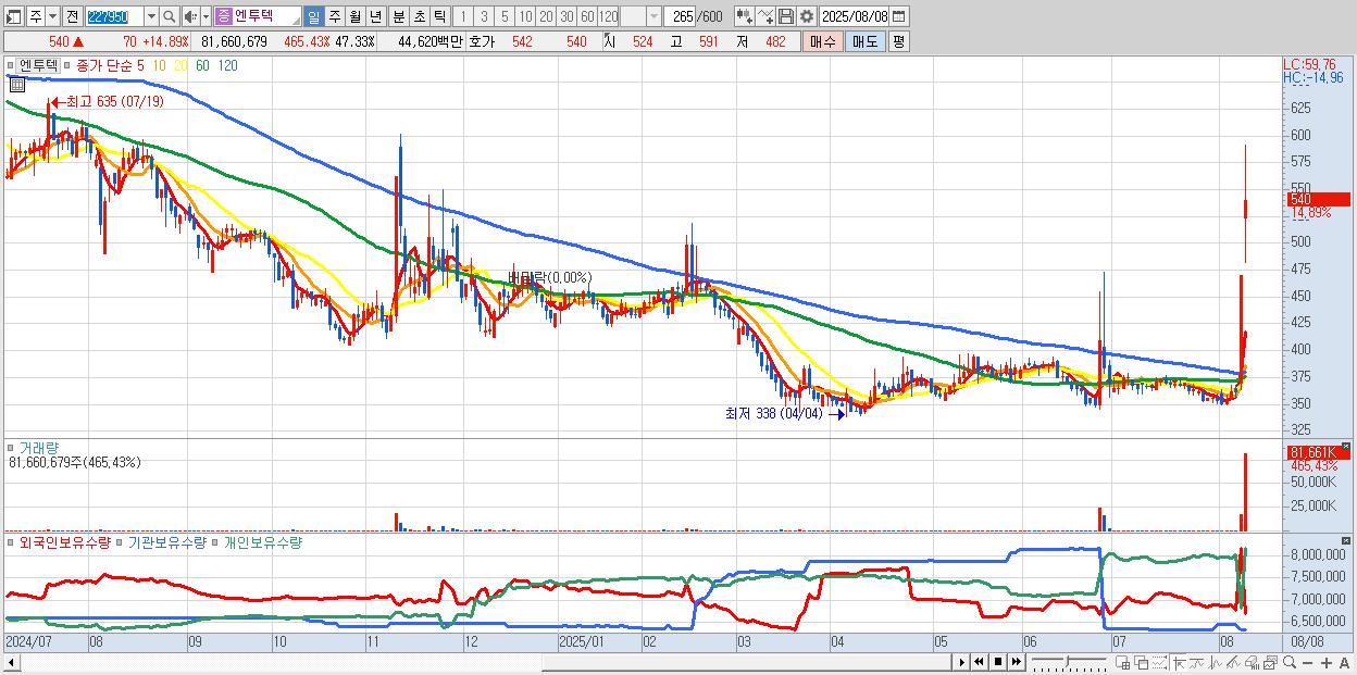 - 엔투텍 (540원 ▲ 14.89% , 시총: 932억, 거래량: 81,660,679, 거래대금:446억)