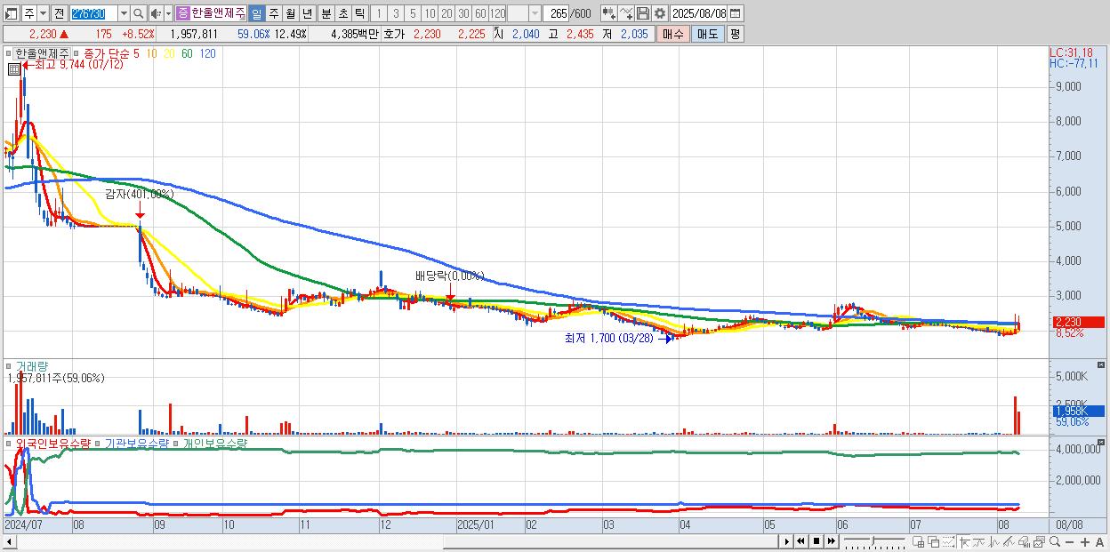 - 한울앤제주 (2,230원 ▲ 8.52% , 시총: 350억, 거래량: 1,957,811, 거래대금:44억)