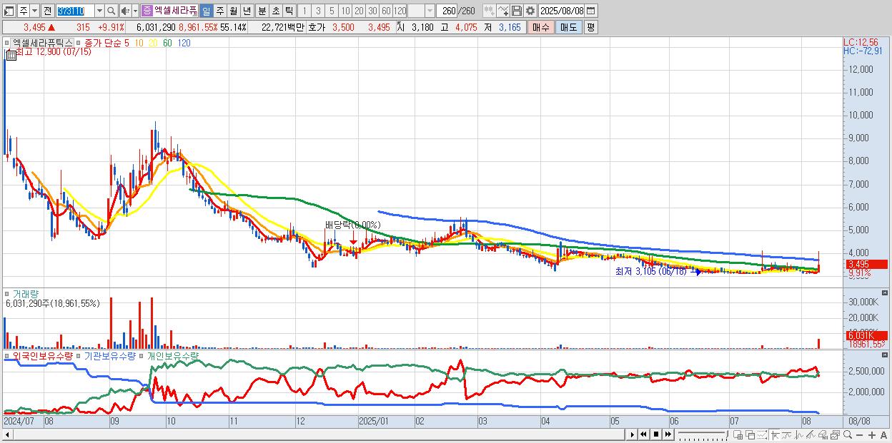 - 엑셀세라퓨틱스 (3,495원 ▲ 9.91% , 시총: 382억, 거래량: 6,031,290, 거래대금:227억)