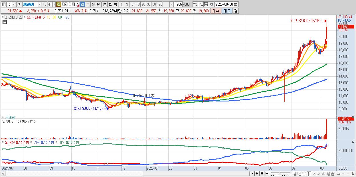- 파라다이스 (21,650원 ▲ 11.03% , 시총: 19,801억, 거래량: 5,778,587, 거래대금:1,257억)