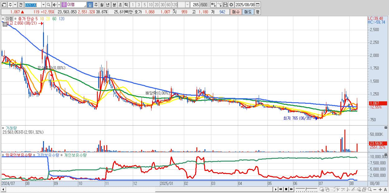 - 이렘 (1,067원 ▲ 12.55% , 시총: 650억, 거래량: 23,563,053, 거래대금:256억)