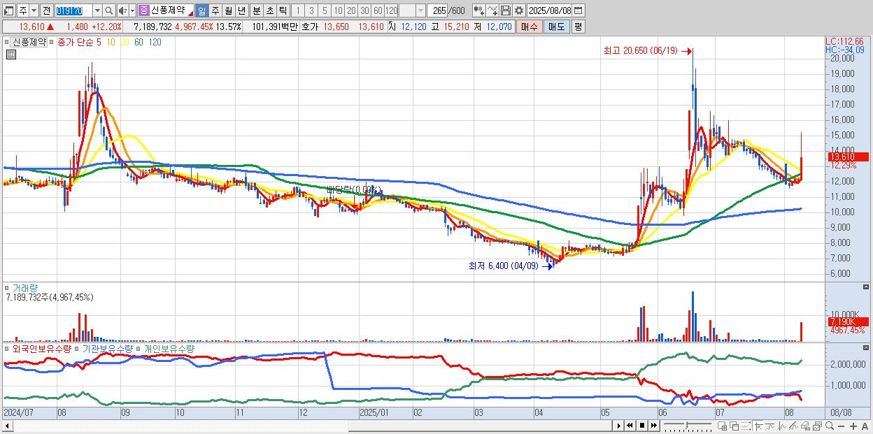 - 신풍제약 (13,830원 ▲ 14.01% , 시총: 7,328억, 거래량: 3,079,619, 거래대금:435억)