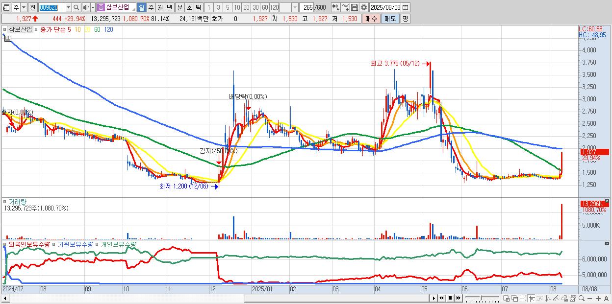 - 삼보산업 (1,927원 ▲ 29.94% , 시총: 316억, 거래량: 13,295,723, 거래대금:242억)