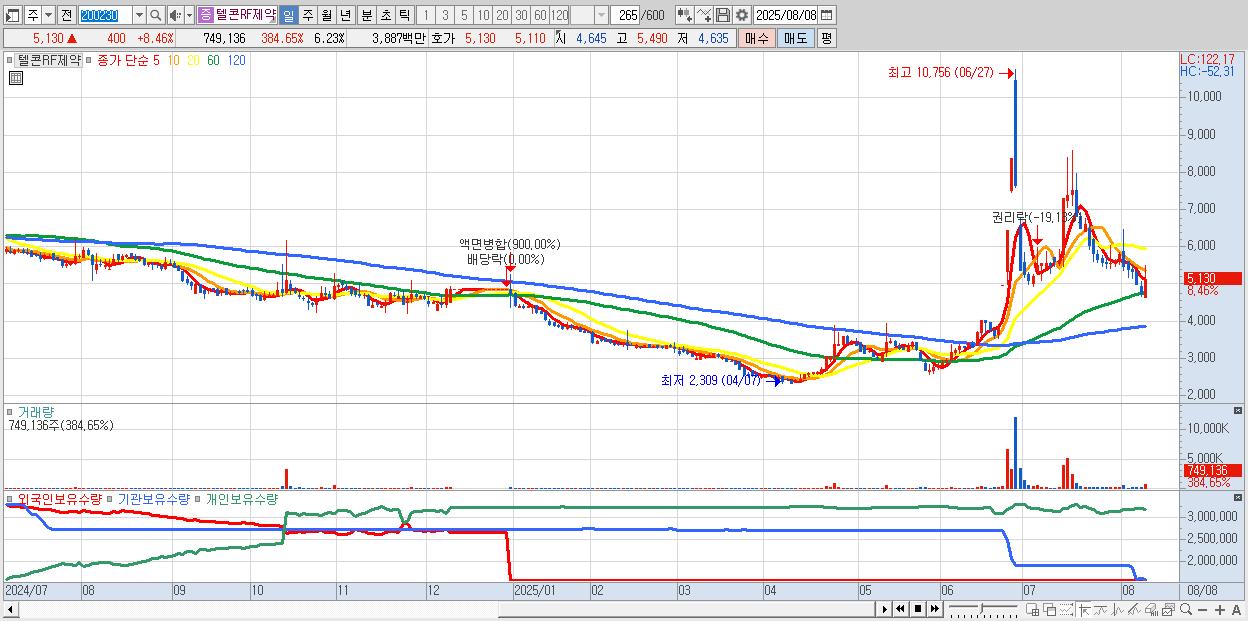 - 텔콘RF제약 (5,130원 ▲ 8.46% , 시총: 617억, 거래량: 749,136, 거래대금:39억)