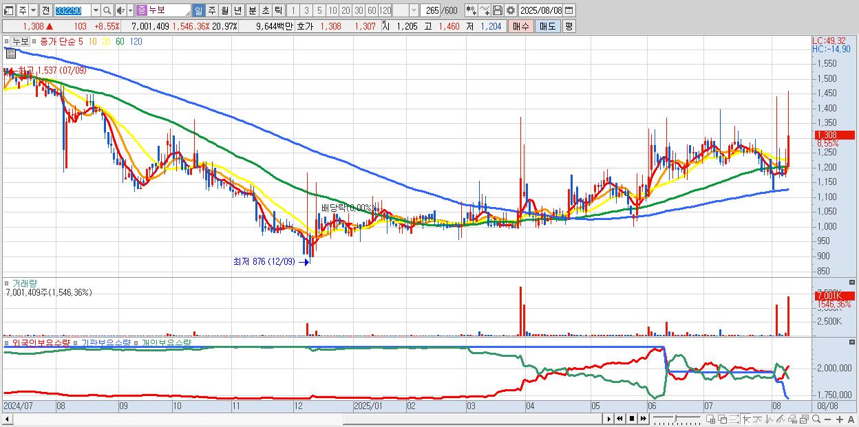 - 누보 (1,308원 ▲ 8.55% , 시총: 437억, 거래량: 7,001,409, 거래대금:96억)