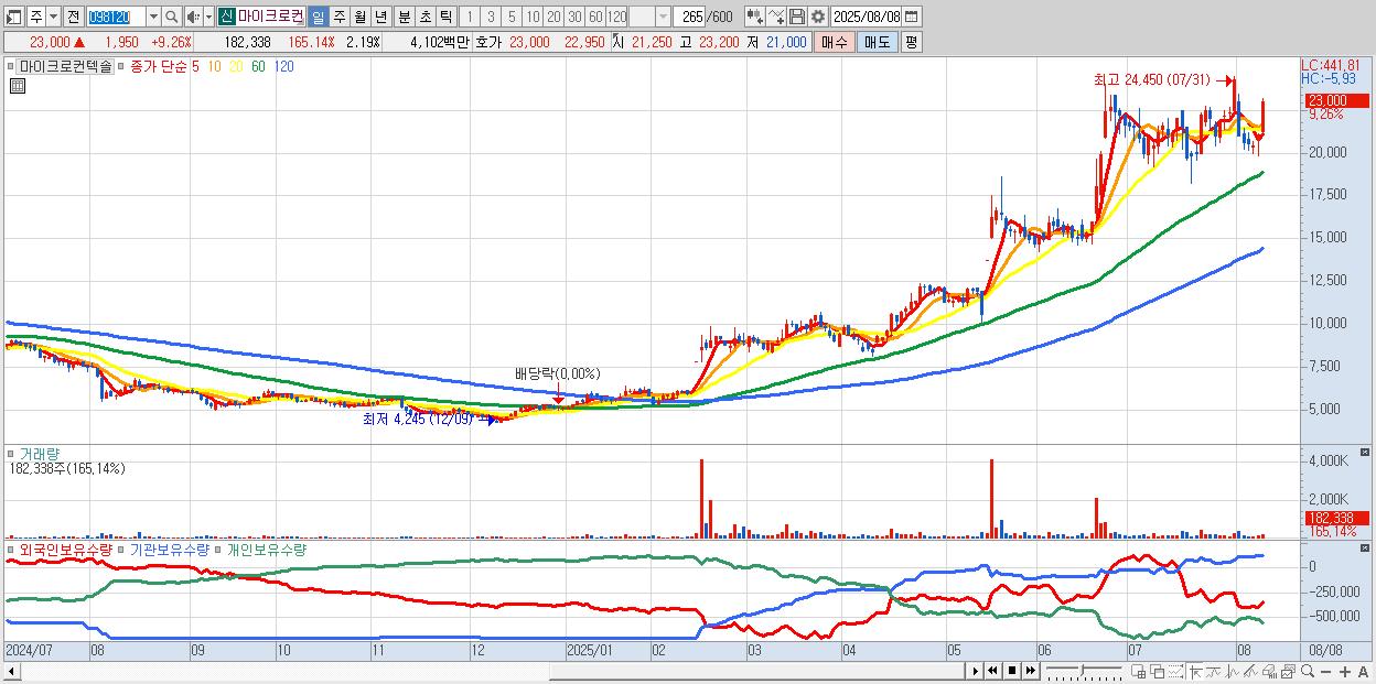 - 마이크로컨텍솔 (23,000원 ▲ 9.26% , 시총: 1,912억, 거래량: 182,338, 거래대금:41억)