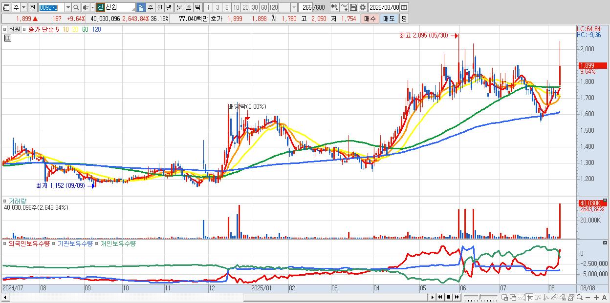 - 신원 (1,899원 ▲ 9.64% , 시총: 2,101억, 거래량: 40,030,096, 거래대금:770억)