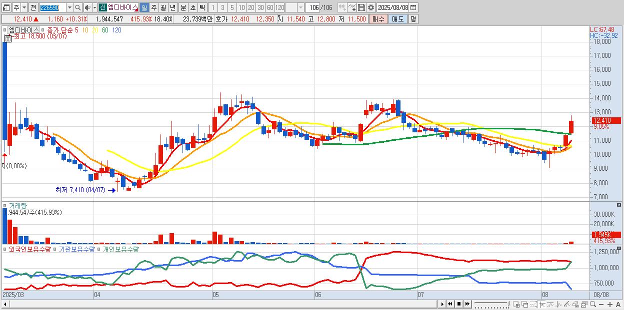 - 엠디바이스 (12,380원 ▲ 10.04% , 시총: 1,308억, 거래량: 852,608, 거래대금:104억)