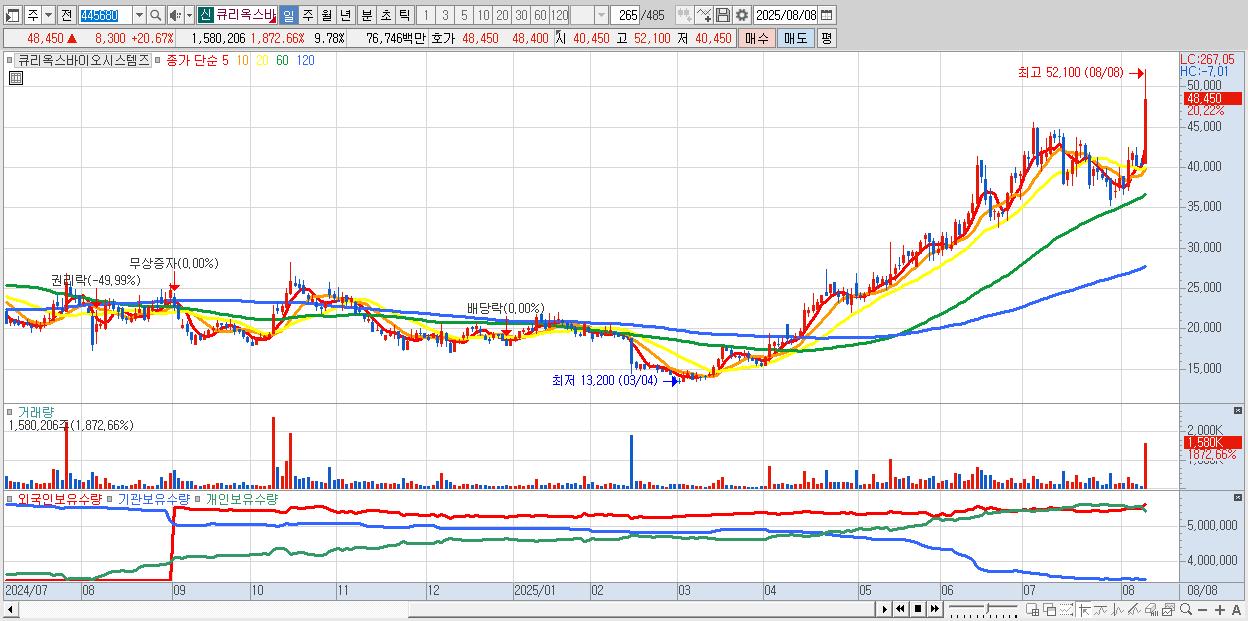 - 큐리옥스바이오시스템즈 (50,200원 ▲ 25.03% , 시총: 8,114억, 거래량: 807,622, 거래대금:392억)