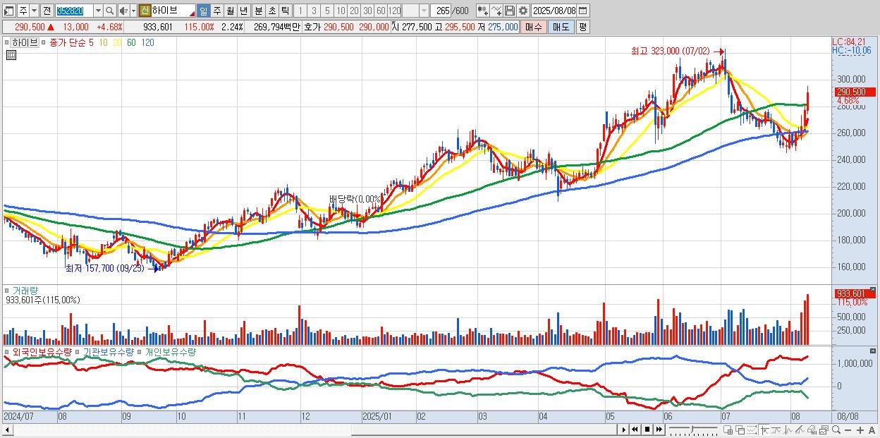 - 하이브 (291,000원 ▲ 4.86% , 시총: 121,208억, 외국인 순매수 거래금:62억)